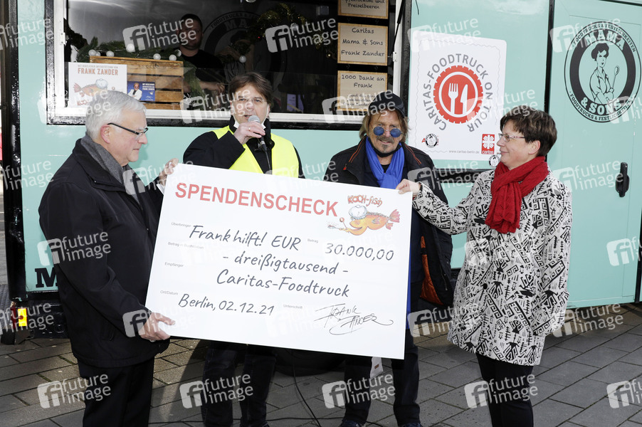 Erzbischof Heiner Koch, Marcus Zander, Frank Zander und Caritasdirektorin Ulrike Kostka bei der Spendenscheckübergabe an den Caritas-Foodtruck und der Verteilung von Essen und Geschenken aus dem Food Truck an Obdachlose und Bedürftige am Alexanderplatz. Berlin, 02.12.2021