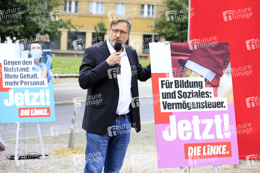 Jörg Schindler beim Fototermin zur Präsentation der Plakatkampagne der Partei Die Linke zur Bundestagsswahl 2021 vor der Volksbühne am Rosa-Luxemburg-Platz. Berlin, 21.07.2021