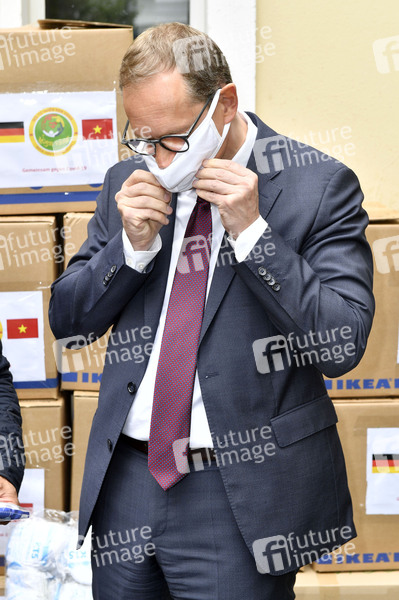 Michael Müller bei der Entgegennahme der Spende von Masken und Handschuhen des vietnamesischen Wohltätigkeitsvereins Hoi tu thien Sen Vang Berlin in Pankow. Berlin, 25.05.2020