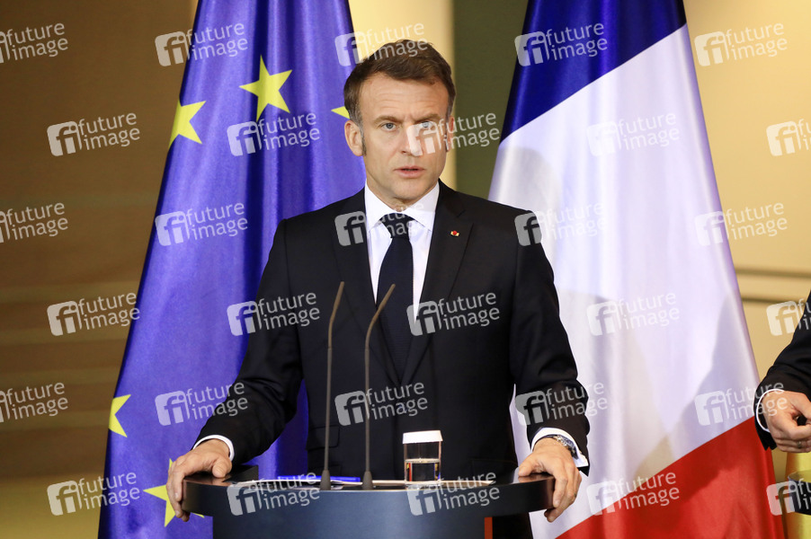 Emmanuel Macron beim Empfang des Staatspräsidenten der Französischen Republik zu einem gemeinsamen Gespräch mit dem Bundeskanzler mit anschließendem Pressestatement im Bundeskanzleramt. Berlin, 18.03.2025