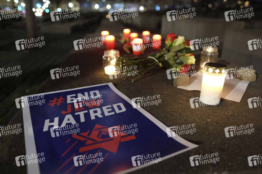 #ENDJEWHATRED - Blumen und Kerzen auf einer Stele am Berliner Denkmal für die ermordeten Juden Europas (Holocaust-Mahnmal) anlässlich des 76. Jahrestages der Befreiung des Konzentrations- und Vernichtungslagers Auschwitz am 27. Januar.