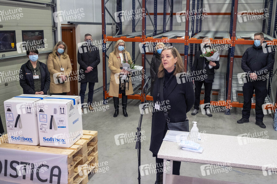 Gesundheitsministerin Svandis Svavarsdottir bbei der Ankunft der ersten Lieferung des Corona-Impfstoffs von Pfizer/Biontech im Lager des Logistikunternehmens Distica auf Island, Gardabaer, 28.12.2020