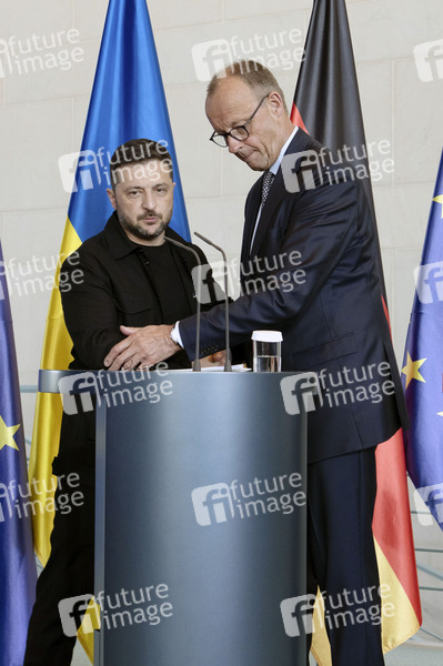 Wolodymyr Selenskyj und Friedrich Merz beim Pressestatement zum virtuellen Treffen zur Ukraine im Bundeskanzleramt. Berlin, 13.08.2025