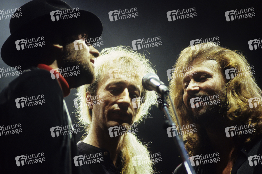 Maurice Gibb, Robin Gibb und Barry Gibb von den Bee Gees live bei einem Konzert der 'High Civilisation'-Tour. London, 07.07.1991