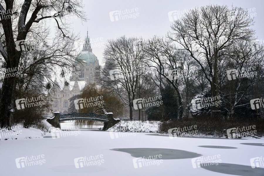 Zugefrorener schneebedeckter Maschteich und Neues Rathaus. Hannnover, 08.02.2021