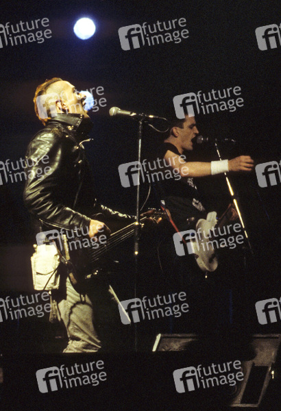 Joe Strummer und Nick Sheppard von The Clash live bei einem Konzert der 'Out of Control'-Tour in der Brixton Academy. London, 06.12.1984