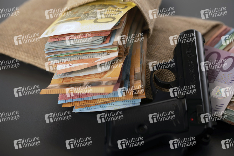 Überfall, Geld, Ersparnisse, Banknoten, Geldscheine, Vermögen, Euro, Geldschein, €, Einbruch, Einbrecher, Dieb, Diebstahl, Straftat, Waffe, Pistole, Walther PPK, Täter, Opfer, Raubstraftat, Raub, Ausrauben, Angriff, Beute, Symbolbild, Themenbild