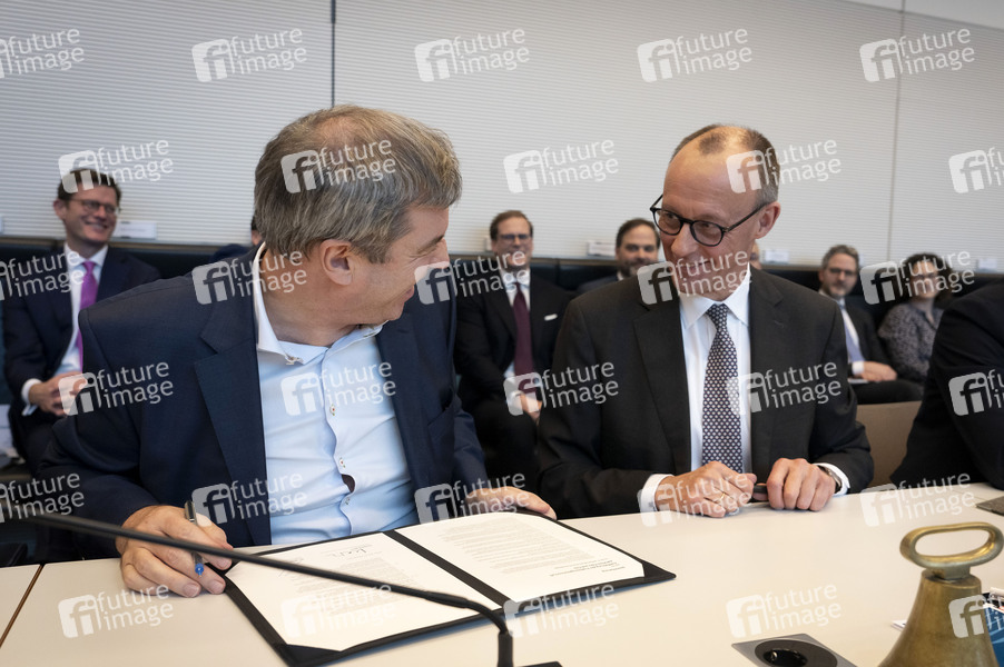 Markus Söder und Friedrich Merz bei der konstituierenden Fraktionssitzung mit Unterzeichnung des Vertrags über die Fortführung der Fraktionsgemeinschaft von CDU und CSU im Reichstagsgebäude. Berlin, 25.02.2025