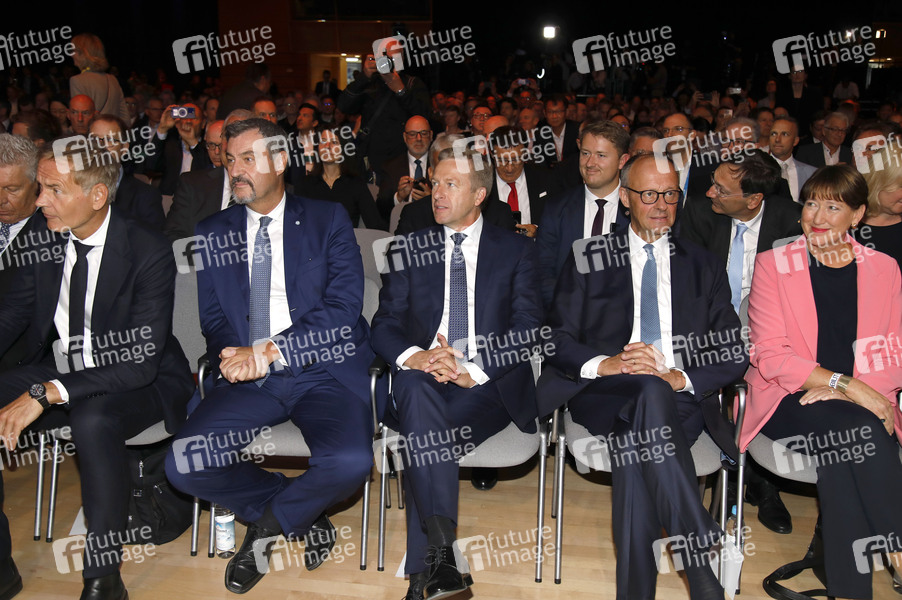 Oliver Blume, Markus Söder, Oliver Zipse, Friedrich Merz und Hildegard Müller bei der Eröffnung der Automesse IAA Mobility 2025 in der Messe München. München, 09.09.2025