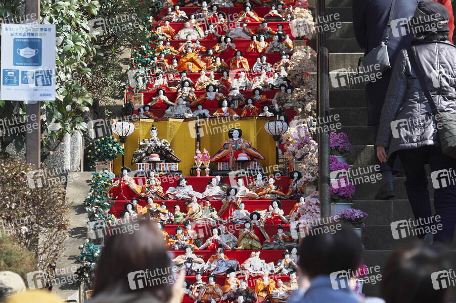 Etwa 1000 traditionelle Hina-Puppen auf den 77 Stufen des Zama-Schreins. Das Hina Matsuri, das Puppen- oder Mädchenfest, findet in Japan jedes Jahr am 3. März statt. Hierbei handelt es sich um ein japanisches Familienfest, anlässlich dessen für Glück und Gesundheit junger Mädchen gebetet wird. Zama, 01.03.2022