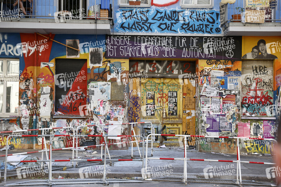 Eingang, Hausbesetzer, Linksextreme, Linkes Wohnprojekt, Linksextremismus, Brandschutz, Räumung, Räumungsklage, Brandschutzgutachten, Begehung, teilbesetztes Haus, Firma Lafone Investments Ltd., Eigentümer, Hauseigentümer, Wahlkampfthema, Berliner Senat, Berliner Politik, linke Szene, Friedrichshain, Brandschutz, Gewalt, Gewaltbereitschaft, Polizei, Polizisten, Polizeieinsatz