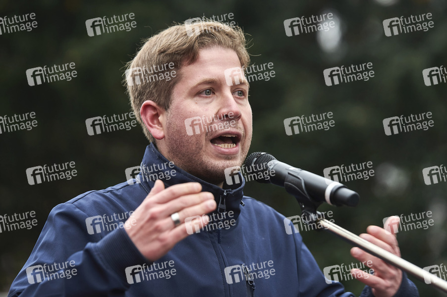 Kevin Kühnert bei der Demonstration von Beschäftigten des Mercedes Benz-Werks in Berlin-Alt-Mariendorf unter dem Motto 'Zukunft oder Widerstand'. Gemeinsam mit der Gewerkschaft IG Metall fordern sie, dass der Stilllegungsbeschluss zumindest teilweise zurückgenommen wird. Berlin, 09.12.2020
