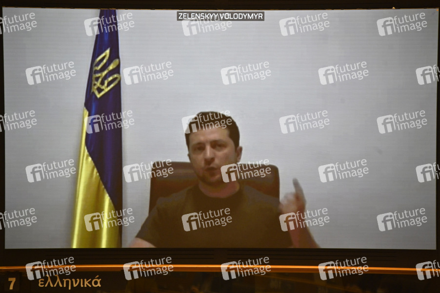 Rede, außerordentliche Sitzung, Politik, Europaparlament, EU-Parlament, EP, Parlament der Europäischen Union, Parlamentum Europaeum, MdEP, Mitglied des Europäischen Parlaments, Krieg, Angriffskrieg, Einmarsch, Europapolitik, internationale Krise, internationale Politik, internationales Recht, Konflikt, Krieg, Kriegsbeginn, Kriegsverbrechen, Krise, Militäroffensive, Militärschlag, Sanktionen, Solidarität, Solidaritätsbekundung, Ukraine, Ukrainekonflikt, Ukraine-Konflikt, Ukrainekrise, Ukraine-Russland-Krise, Politiker, Wolodymyr Selenskyj, Schauspieler, Regisseur, Monderator, Produzent, Präsident der Ukraine