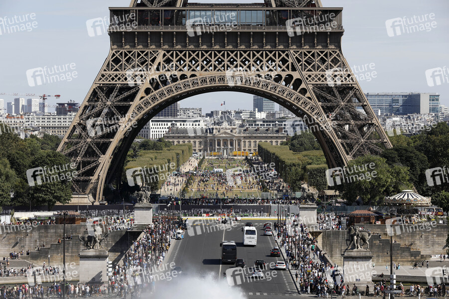Tourismus, Touristen, Sightseeing, Stadt der Liebe, Wahrzeichen, Eiffelturm, Architektur, Sommer in Paris, Reiseziel, Frankreich, Kultur, Esplanade du Trocadero, École Militaire, Marsfeld, Touristen, Menschenmassen