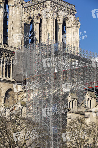 Südseite mit Einrüstung beim Besuch der Kathedrale Notre-Dame de Paris, in der am 15. April 2019 ein Großbrand entstanden war. Viele Teile des Dachstuhls verbrannten sowie der weltberühmte Vieringsturm aus Holz fiel dem Feuer zum Opfer. Frankreichs Präsident kündigte nach dem Brand den sofortigen Wiederaufbau an.. Paris, 14.11.2021