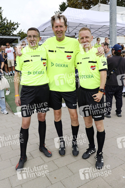 Das Schiedsrichterteam mit Lou Richter beim Benefiz-Fußballspiel 'Kicken mit Herz' 2023 zu Gunsten des Herzzentrums des UKE im Stadiun Hoheluft. Hamburg, 03.09.2023