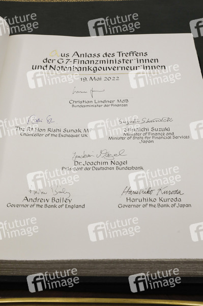 Die Signaturen beim Bildtermin vom Eintrag einiger G7-Finanzminister und Notenbankgouverneure ins Goldene Buch der Stadt Bonn im Alten Rathaus. Bonn, 19.05.2022