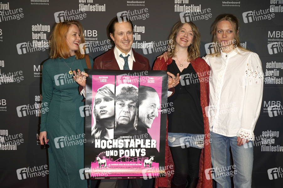 Sophie Meister, Timo Jacobs, Sarah Nevada Grether und Eva Ariane Heise bei der Premiere des Kinofilms 'Hochstapler und Ponys' auf dem achtung berlin Filmfestival 2025 im Kino Babylon. Berlin, 08.04.2025