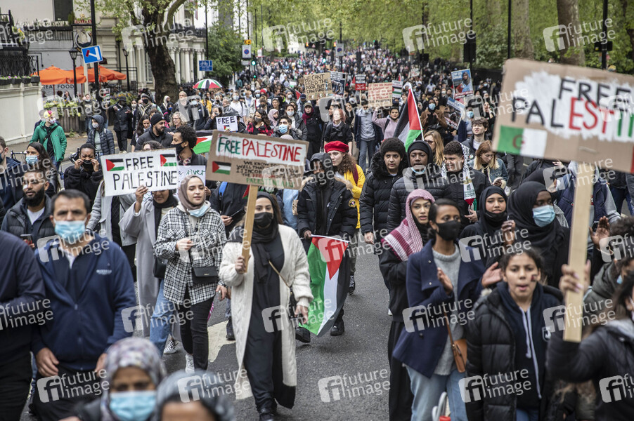 Demonstration gegen staatliche Gewalt und Solidarität mit Palästina. Spannungen in Jerusalem haben zu grenzüberschreitenden Luftangriffen zwischen Israel und Militanten in Gaza geführt, bei denen bisher mindestens 119 Palästinenser und 8 Israelis getötet wurden. London, 15.05.2021