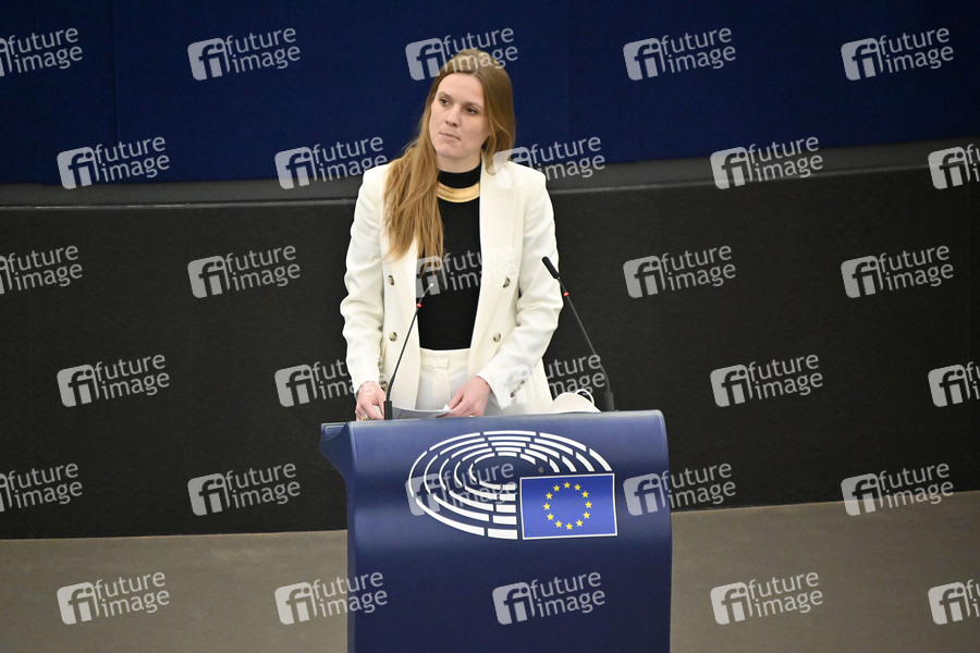 Terry Reintke bei einer Plenartagung mit Laufenden Anhörungen gemäß Artikel 7 Absatz 1 EUV zu Polen und Ungarn im Plenarsaal des Europäischen Parlaments. Straßburg, 06.04.2022