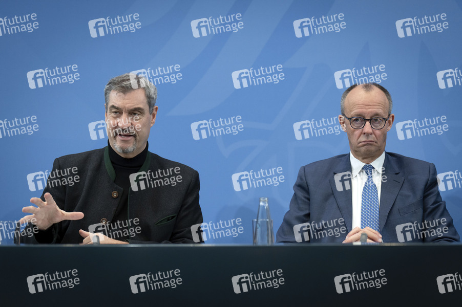 Markus Söder und Friedrich Merz beim Pressestatement zu den Ergebnissen der Beratungen vom Koalitionsausschuss im Bundeskanzleramt. Berlin, 28.11.2025