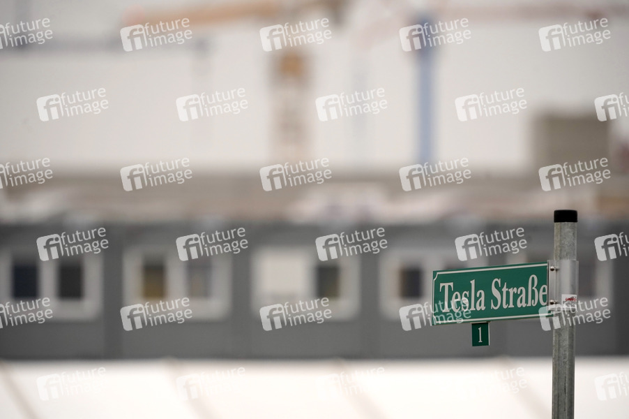 Tesla, Elektroauto, Elektrofahrzeuge, PKW, Auto, Model Y, Model 3, Großfabrik, Automobilhersteller, Autobauer, Elektromobilität, umweltfreundlich, Baustelle, Bauen, Baubranche, Bau-Branche, Bauarbeiten, Großbaustelle, Kran, Kräne, Baustelle, Straßenschild
