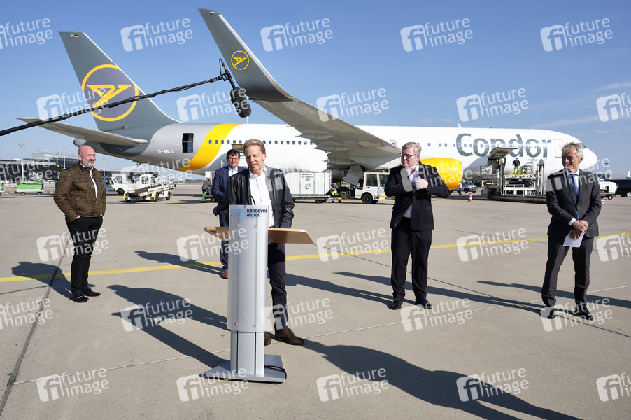 Bernd Osterloh (Vorsitzender des Gesamt- und Konzernbetriebsrats der Volkswagen AG), Gunnar Kilian (Vorstandsmitglied der Volkswagen AG), Raoul Hille (Geschäftsführer des Flughafens Hannover), Bernd Althusmann (Niedersächsischer Minister für Wirtschaft) und Ralf Teckentrup (CEO von Condor Flugdienst) - Volkswagen empfängt Luftfracht mit 5 Million Schutzmasken und medizinische Hilfsmaterialien aus China auf dem Hannover Airport. Hannover, 26.04.2020