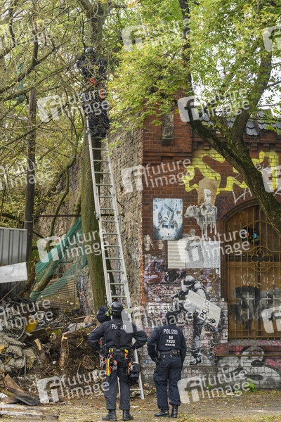 Räumung des linksautonomen Wagenplatzes 'Köpi'. Die Bewohner hatten im Vorfeld angekündigt, sie wollen nicht kampflos aufgeben. Rund eine Stunde haben die Barrikaden des linksautonomen Wagencamps gehalten, dann durchbrach die Polizei den Zaun an mehreren Stellen. Es gab Festnahmen. Berlin, 15.10.2021