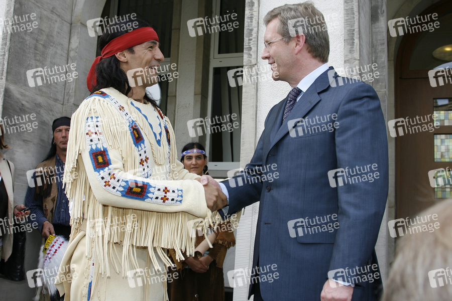 Das Ensemble der Karl-May-Spiele 2009 nimmt Ministerpräsident Wulff in den Kreis der Ehrenhäuptlinge auf. Dazu fanden sich die Mitwirkenden von 'Der Schatz im Silbersee' in der Niedersächsischen Staatskanzlei in Hannover ein.