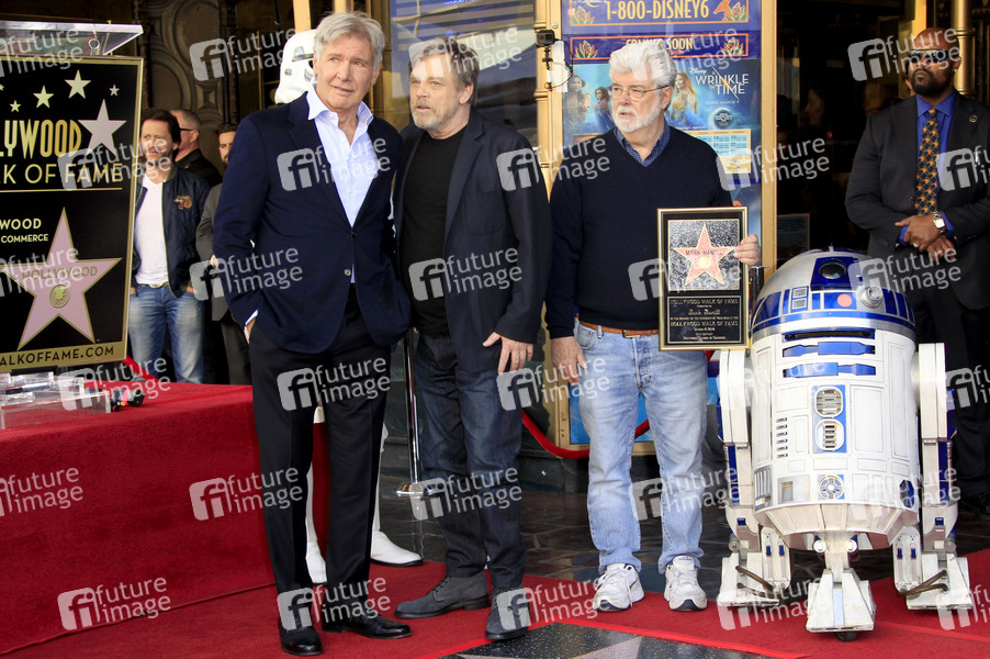 Harrison Ford, Mark Hamill und George Lucas bei der Zeremonie zur Verleihung von einem Stern an Mark Hamill auf dem Hollywood Walk of Fame. Los Angeles, 08.03.2018