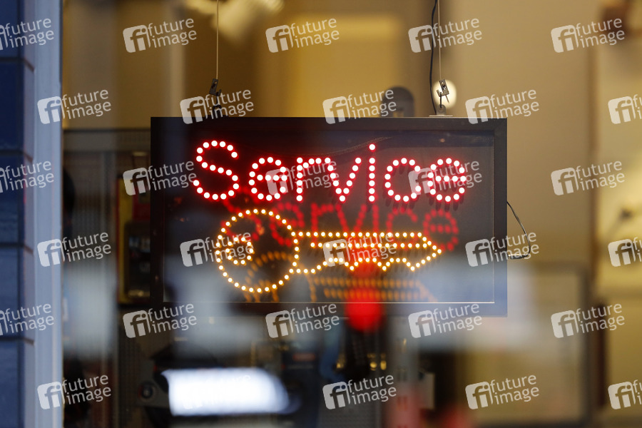 Eine Leuchtreklame für Schlüsseldienst Service an einem Fachgeschäft für Schlösser, Türen und Türschlösser. (Themenbild, Symbolbild) Köln, 12.04.2021