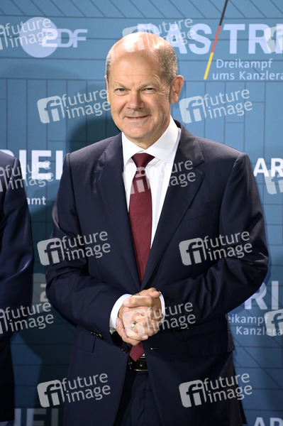 Olaf Scholz beim 'Triell - Dreikampf ums Kanzleramt' von ARD und ZDF mit den Kanzlerkandidaten im Studio Berlin-Adlershof. Berlin, 12.09.2021