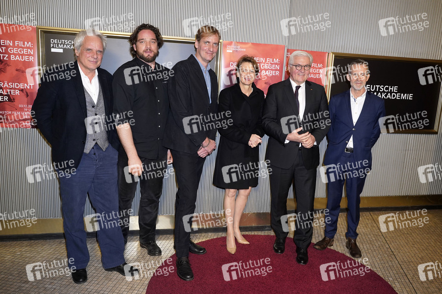 Thomas Kufus, Ronald Zehrfeld, Lars Kraume, Elke Büdenbender, Frank-Walter Steinmeier und Ulrich Matthes beim Fototermin zur Veranstaltungsreihe 'Mein Film' mit Gespräch und Präsentation des Fernsehfilms 'Der Staat gegen Fritz Bauer' in der Astor Film Lounge. Berlin, 03.12.2019