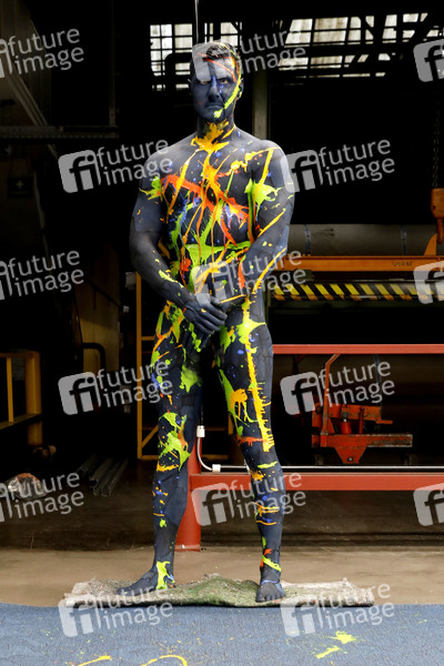 Bodyart-Künstler Jörg Düsterwald realisiert zum Thema 'Vielfältigkeit' mit verschiedenen Fotomodell-Typen eine Kunstwerk-Serie. In den Produktionshallen des kooperierenden Unternehmens Vorwerk flooring in Hameln hat er das männliche Model Michael passend zum gesponserten Bodenbelag mit einem Bodypainting versehen und anschließend flüssige Farbspuren aufgetragen.