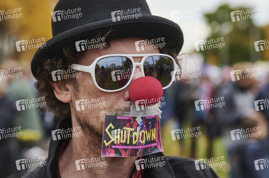 Unter dem Motto 'Wiederherstellung aller Grund- und Menschenrechte und die sofortige Beendigung des Pandemiezustands' demonstrieren Corona-Leugner vom Berliner Alexanderplatz zur Karl-Marx-Allee. Die Polizei nahm mehrere Demonstranten fest. Berlin, 25.10.2020