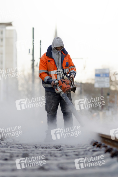 Ein Bauarbeiter bläst Betonstaub von Bahnschienen. Köln, 27.03.2020
