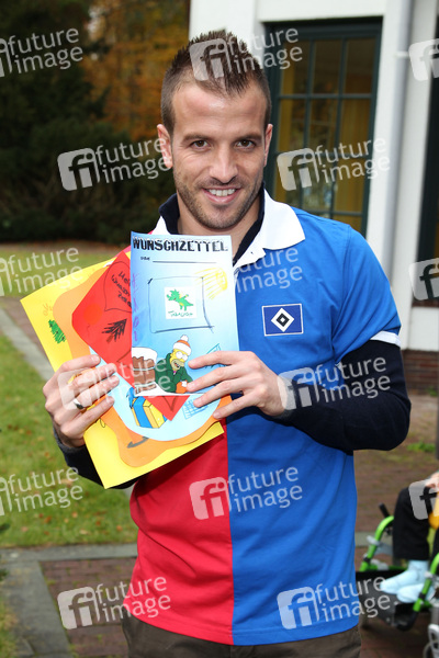 HSV-Spieler Rafael van der Vaart und HSV-Maskottchen Hermann schmücken einen Weihnachtsbaum im Kinder-Hospiz Sternenbrücke, Hamburg