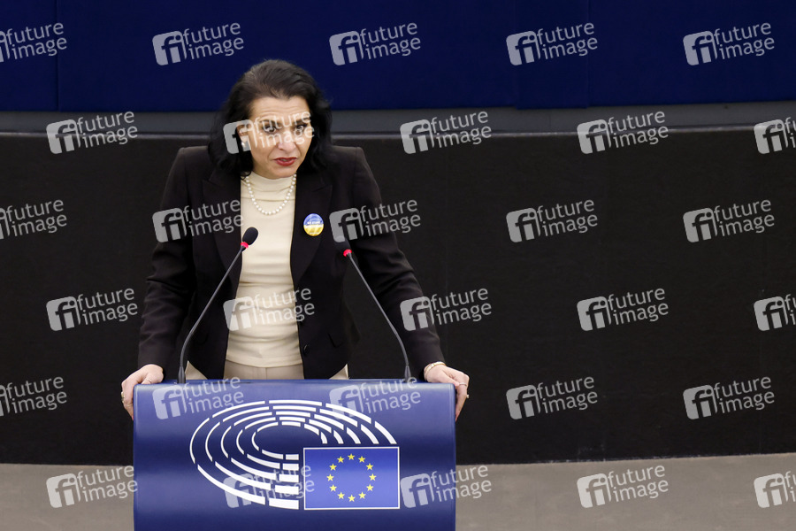 Abir Al-Sahlani im Plenarsaal des Europäischen Parlaments. Straßburg, 07.03.2022