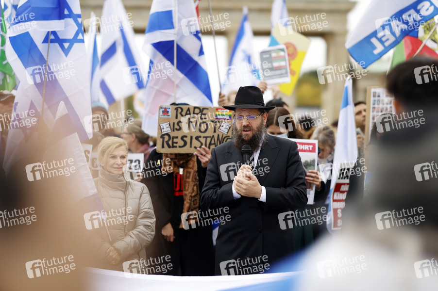Yehuda Teichtal bei der Demonstration zum Jahrestag des Hamas-Massakers in Israel unter dem Motto 'Gemeinsam gegen das Verbrechen der Hamas an Israelis und Palästinensern. Für die Freilassung der Geiseln und das Ende der Hamas-Herrschaft in Gaza.' vom Brandenburger Tor zum Bebelplatz. Berlin, 06.10.2024