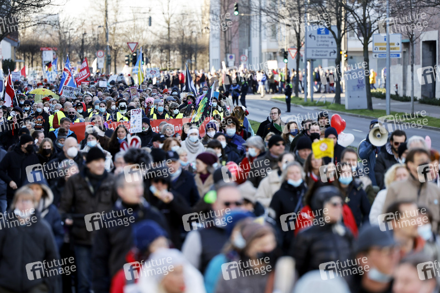 Bei einer angemeldeten Demo unter dem Motto 'Freie Impfentscheidung, Herr Lauterbach!' demonstrierten Tausende Gegner einer Impfpflicht mit einem Spaziergang gegen die Corona-Maßnahmen der Bundesregierung und für eine individuelle Impfentscheidung, Grundrechte und 'unversehrte' Kinder - darunter auch viele Pflegekräfte, die wegen der Impfpflicht im Gesundheitsbereich ihren Job zu verlieren drohen. Düsseldorf, 26.02.2022