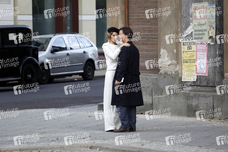 Saskia Rosendahl und Tom Schilling bei Dreharbeiten zum Kinofilm 'Fabian - Der Gang vor die Hunde' am Postplatz Ecke Konsulstrasse. Görlitz, 09.08.2019