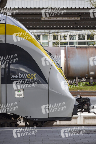 Der Pforzheim Hauptbahnhof in Baden-Württemberg ist ein Durchgangsbahnhof für Interregio- Regionalexpress- und Regionalbahnzüge. Pforzheim, 14.04.2021