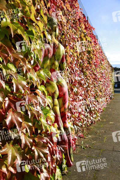 Nature Art: Herbstimpression des Bodyart-Künstlers Jörg Düsterwald mit Aktmodell Pola an einer weinbewachsenen Mauer in Holtensen.