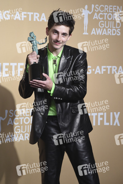 Timothee Chalamet mit dem Preis für den besten Kin-Hauptdarsteller in 'Like a Complete Unknown' beim Preisträger-Photocall der 31. Screen Actors Guild Awards 2025 im Shrine Auditorium and Expo Hall. Los Angeles, 23.02.2025
