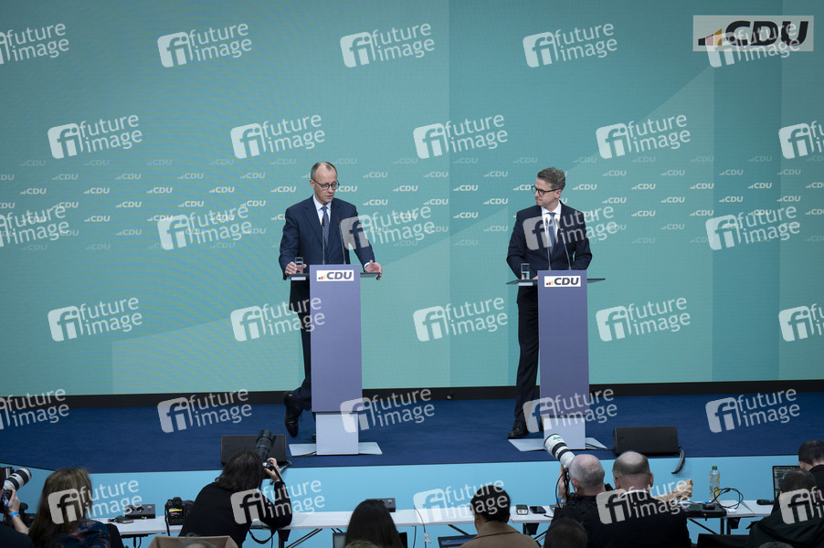Friedrich Merz und Carsten Linnemann bei der Pressekonferenz nach der Sitzung des CDU-Vorstands im Konrad-Adenauer-Haus. Berlin, 24.02.2025