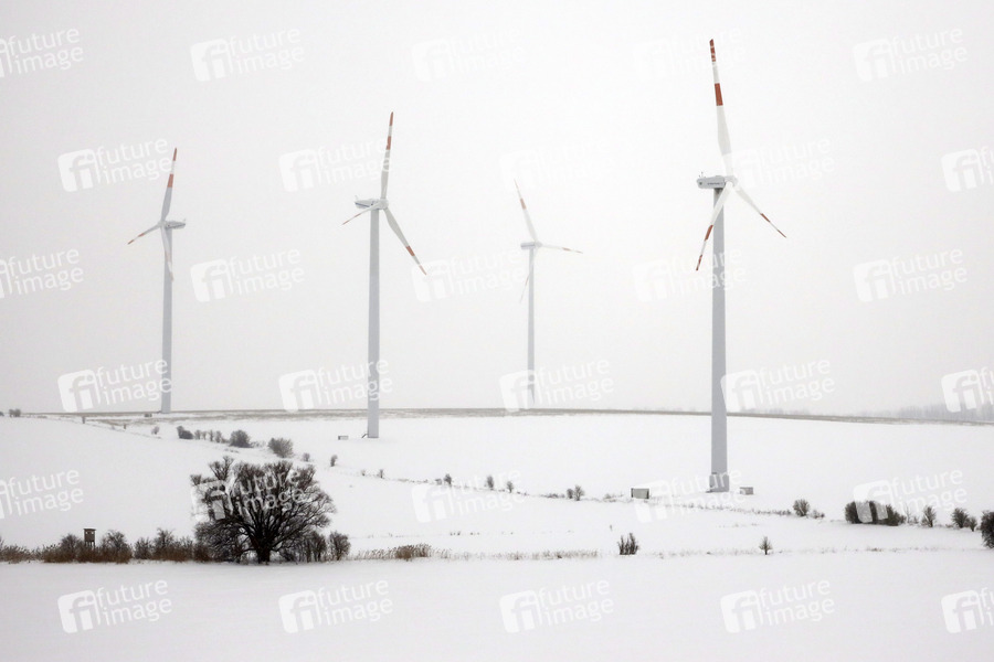 Windräder in einem Brandenburger Windpark stehen bei eisigen Temperaturen still in verschneiter Landschaft. Schnee und Eis machen den Windparks zu schaffen, in vielen Parks zeigten die Rotorblätter Eisansatz und konnten deshalb aus Sicherheitsgründen nicht angefahren werden. (Themenbild, Symbolbild) Berlin, 15.02.2021