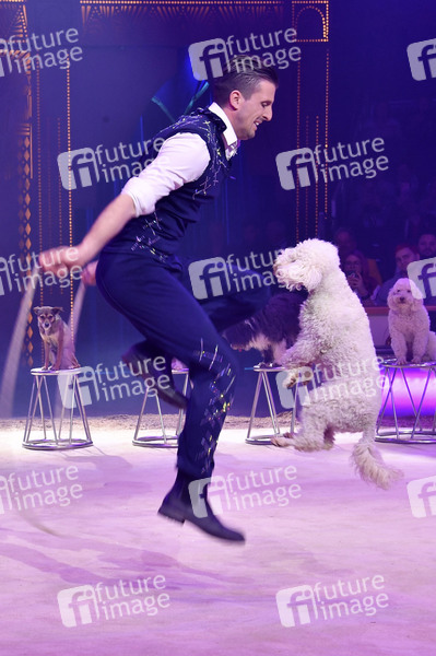 Thomas Lacey mit Hundedressur bei der Premiere des Circus Krone Tourneeprogramms 'Farbenspiel - Gold Edition' im Circus Krone Zelt auf der Theresienwiese. München, 10.04.2025
