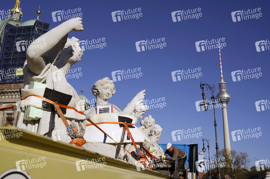 6 von 16 Statuen für den Schlüterhof im Berliner Schloss werden am Lustgarten vom Tieflader Lkw angeliefert. Berlin, 07.11.2020
