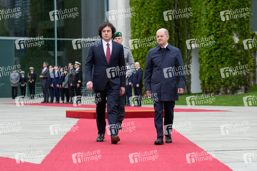 Irakli Kobachidse und Olaf Scholz beim Empfang des Premierministers von Georgien mit militärischen Ehren und zu einem gemeinsamen Gespräch mit dem Bundeskanzler mit anschließendem Pressestatement im Bundeskanzleramt. Berlin, 12.04.2024