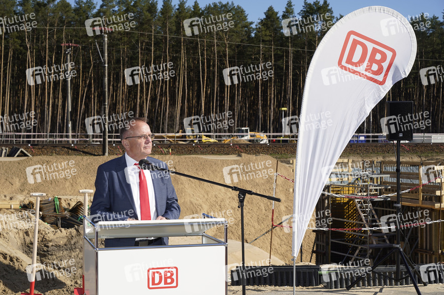 Detlef Tabbert (Minister für Infrastruktur- und Landesplanung in Brandenburg) beim symbolischen Spatenstich für den neuen Bahnhof Fangschleuse nahe dem Tesla-Werk. Er wird bis Ende 2026 zu einem modernen Personen- und Güterbahnhof umgebaut. Hierzu wird die Station mit längeren Bahnsteigen neu errichtet. Künftig können hier mehr und längere Züge im Regionalverkehr fahren. Der Bahnhof wird rund zwei Kilometer westlicher liegen als die bisherige Station. Grünheide, 04.04.2025